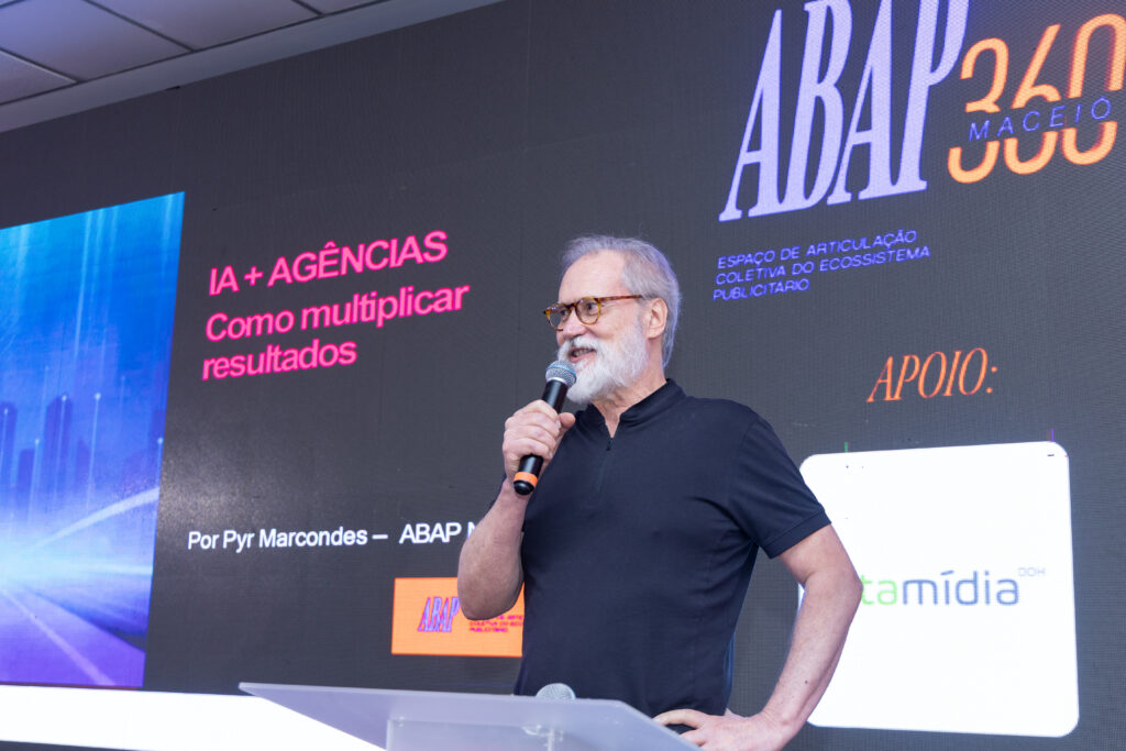 Consultor Estratégico da ABAP, Pyr Marcondes, empresário, especialista em comunicação, inovação e inteligência artificial, subiu ao palco com provocações sobre a adoção e uso da IA pelas agências de publicidade, e também caminhos para a adoção estratégica da tecnologia.